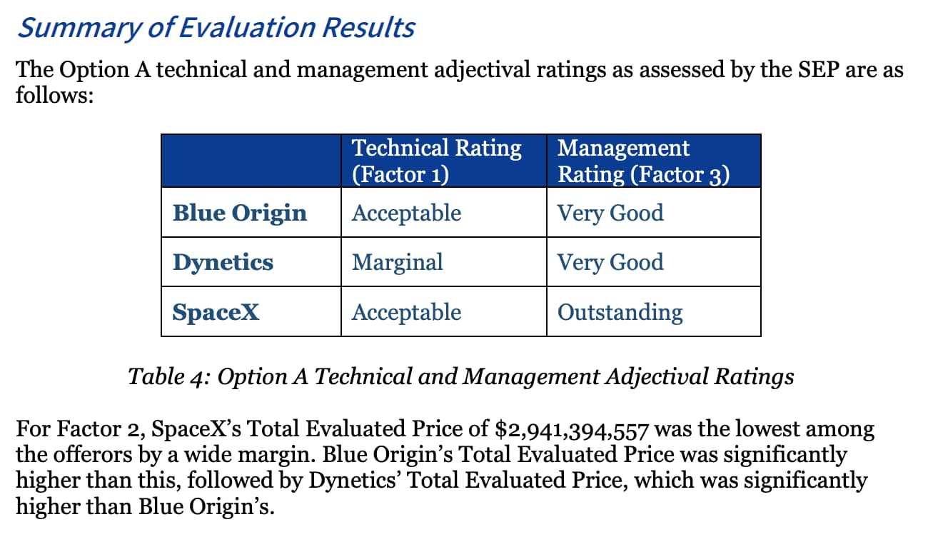 NASA had been expected to choose two contractors to continue onto Option A of the HLS program. Option A includes funds to develop the landers as well as an uncrewed demonstration landing and the final crewed landing in 2024. But without the funds to pay for two contractors, NASA made its choice. SpaceX, by far the cheapest bid is the sole awardee of Option A. According to the source selection document, even SpaceX's initial bid was too much for NASA, but during contract negotiations, SpaceX agreed to spread out its initial milestone payments to fit NASA's budget.